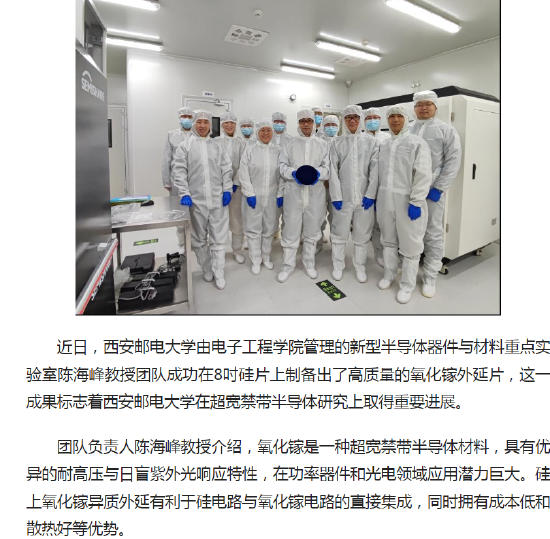 日前,西安邮电大学新型半导体器件与材料重点实验室的陈海峰教授团队成功在8英寸硅片上制备出了高质量的氧化镓外延片,这一成果标志着该校在超宽禁带半导体研究上取得重要进展。