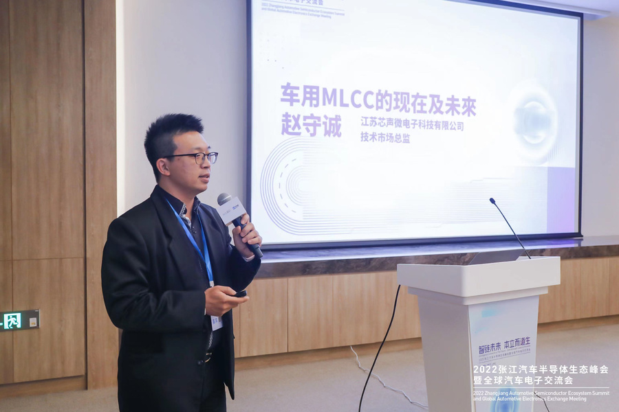 江苏芯声微电子科技有限公司技术市场总监赵守诚发布了以《车用MLCC的现在及未来》为主题的演讲。他分析指出,车规级被动元件市场从油电混合车逐步转向电动汽车。这里面不仅是质的转变,也是量的转变。通常电动车用到3,000颗被动元器件,油电混合用到8,000颗,纯电到18,000颗,这是一个非常大的转变。
